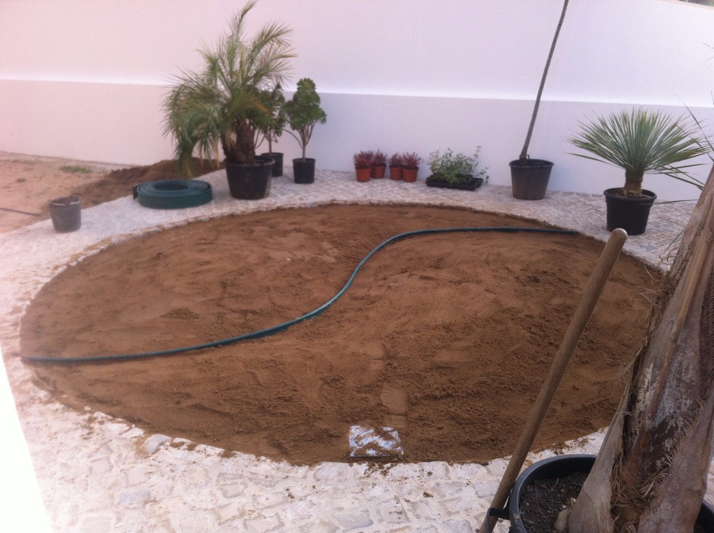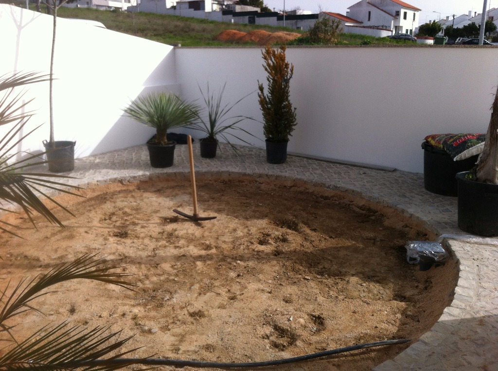Jardim em moradia privada em relva sintética e pequena ilha tropical
